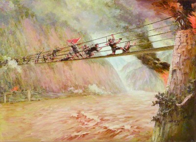 《井冈山看雨》(布面油彩)唐小禾、程犁游客在井冈山“井冈红旗”雕塑前参观、拍照,在人民解放战争和人民革命中牺牲的人民英雄们永垂不朽。