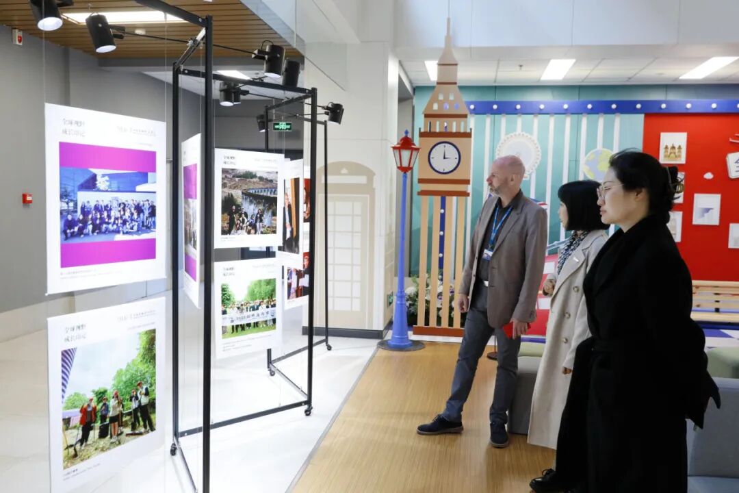 在国际教育学院副院长高卉的陪同下,Philp Perry教授参观了学校图书馆,以及明德楼一层的“全球视野 成长印记”青年领袖训练营项目展。