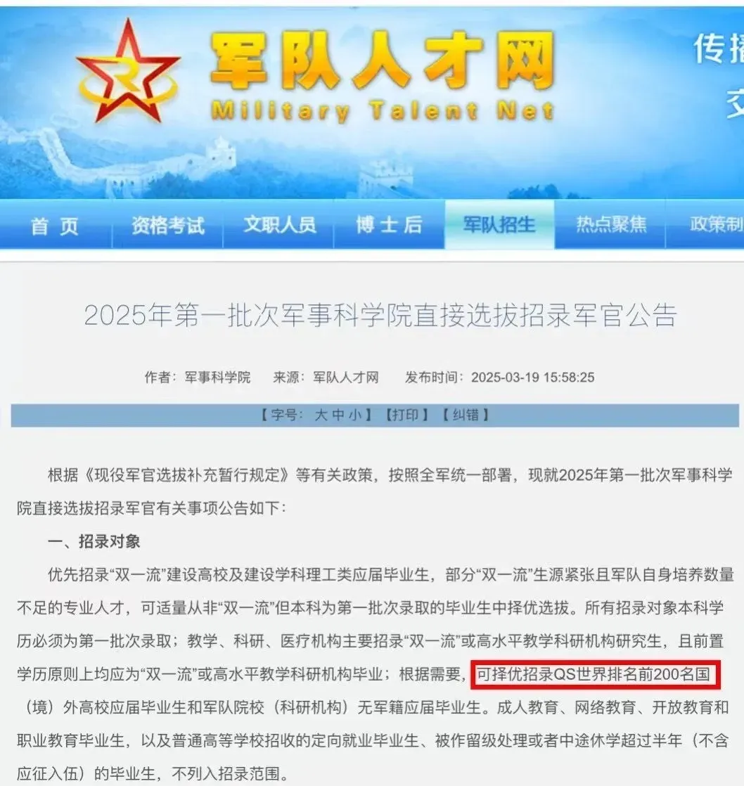 此外,根据军队人才网相关信息显示QS排名前200的海外院校毕业生也首次被纳入了招聘范围。