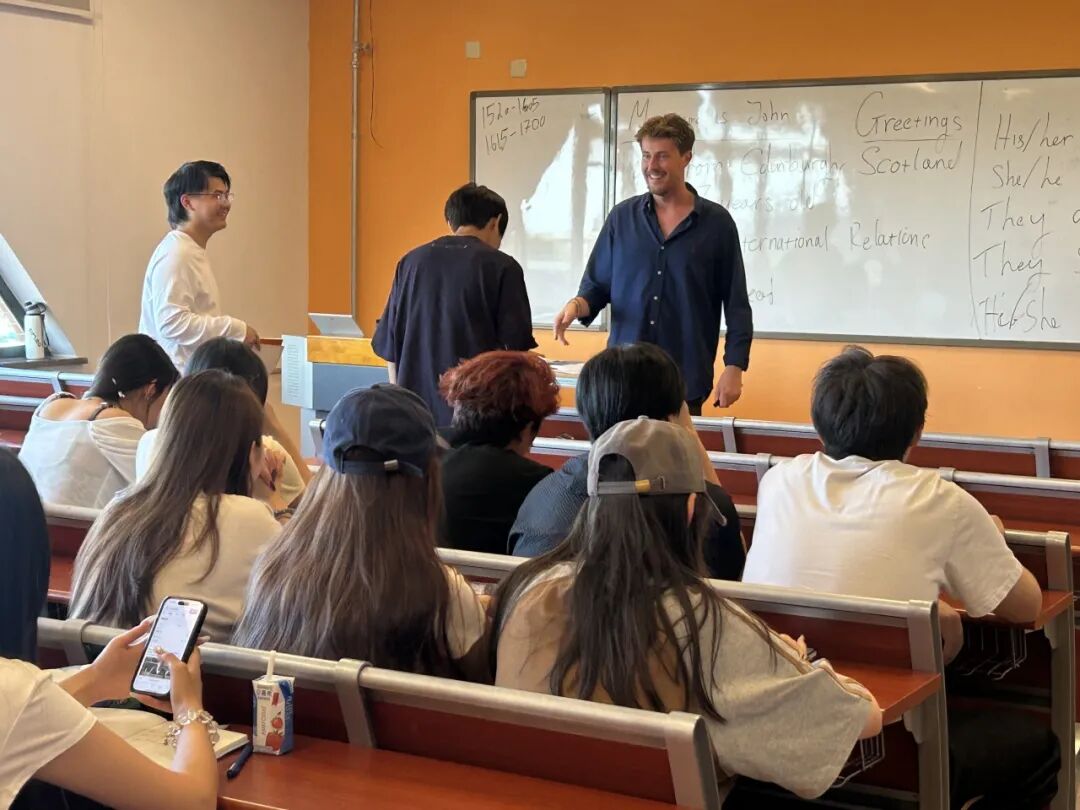 下午,外教们纷纷走入课堂,为同学们带来精彩纷呈的多元文化课程。外教们纯正的发音、幽默的表达和独特的教学方法,迅速吸引了同学们的注意力。外教 Bilal 开启环球漫游记的第一节课,当谈及非洲,他结合自身经历通过照片生动形象地向同学们展示了当地的文化特色。来自英国的外教John热情地向同学们做自我介绍,随后让学生们介绍身边的同学,并在课堂上展示互动。日本的金山教授从大家感兴趣的日本食物讲起,幽默诙谐的讲课方式让学生印象深刻。