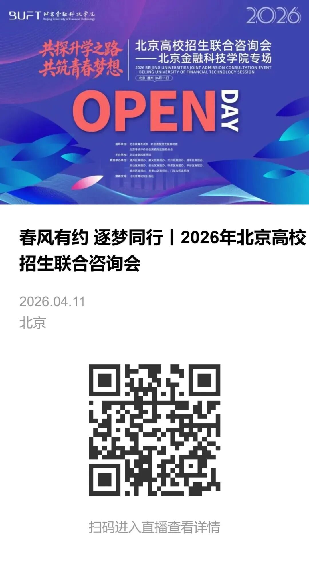 丹墀对策三千字,金榜题名五色春。4月的北京,惠风和畅,天朗气清,11日上午,由北京教育考试院指导、北京高校招生服务联盟(北京考试评价协会高校招生服务分会)支持,北京金融科技学院主办,通州区、顺义区、大兴区、昌平区、房山区、石景山区、门头沟区、密云区、怀柔区、平谷区、延庆区等各区高招办联合举办的“2026年北京高校招生联合咨询会”在北京金融科技学院顺利举行。来自京内外七十余所高校的招生负责人齐聚校园,为考生和家长提供一站式报考咨询服务。活动当天校园全面开放,考生和家长可零距离探访教学楼、实验室、宿舍、餐厅等核心区域,沉浸式体验大学学习与生活环境。