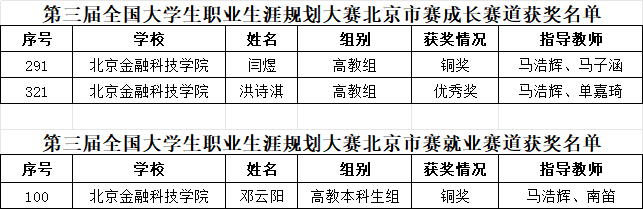 近日,第三届全国大学生职业规划大赛北京市赛决赛圆满落幕,北京金融科技学院学子凭借扎实的专业素养、清晰的职业规划和出色的现场表现,在激烈竞争中脱颖而出,斩获铜奖2项、优秀奖1项,获奖数量稳居民办高校前列。这一成绩不仅是对学生个人能力的肯定,更是我校深化“无边界育人”模式、强化就业指导工作的生动体现。
