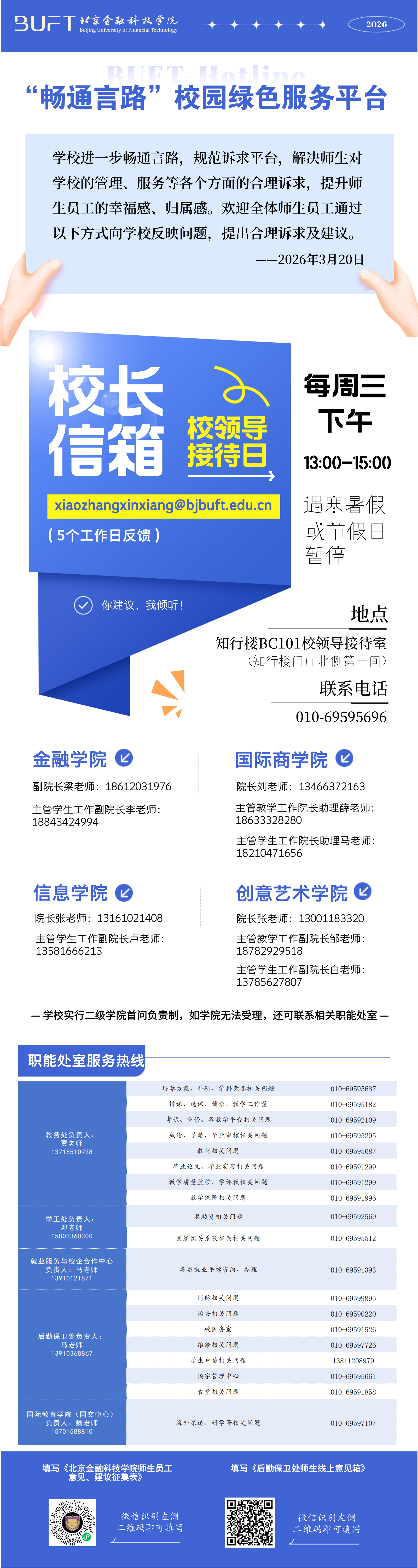 学校进一步畅通言路,规范诉求平台,解决师生对学校的管理、服务等各个方面的合理诉求,提升师生员工的幸福感、归属感。欢迎全体师生员工通过以下方式向学校反映问题,提出合理诉求及建议。